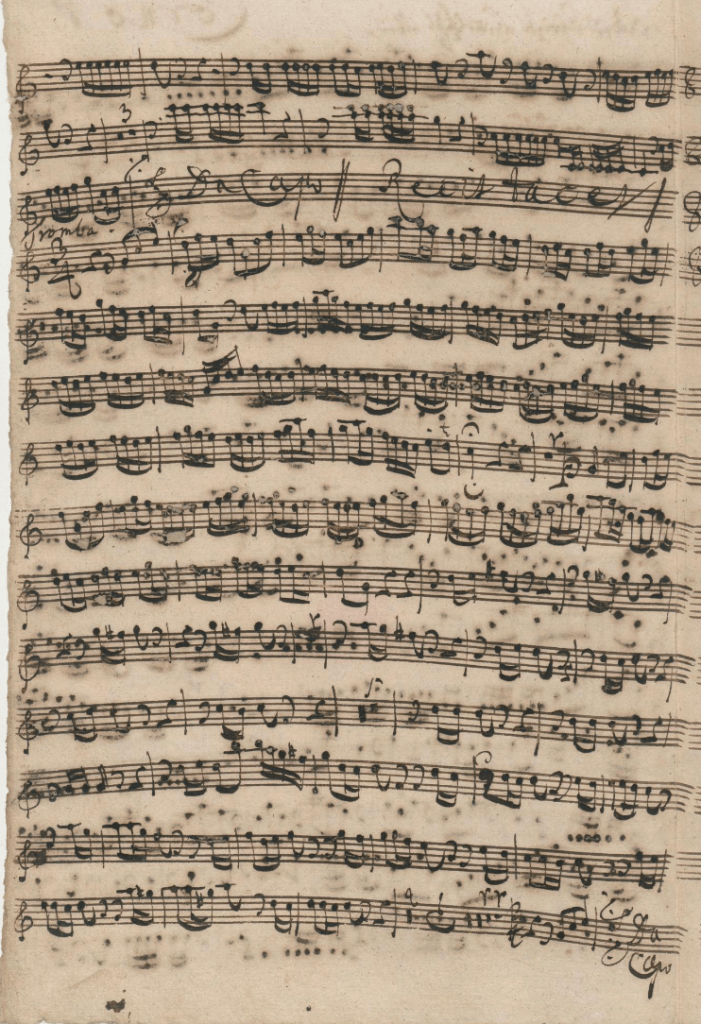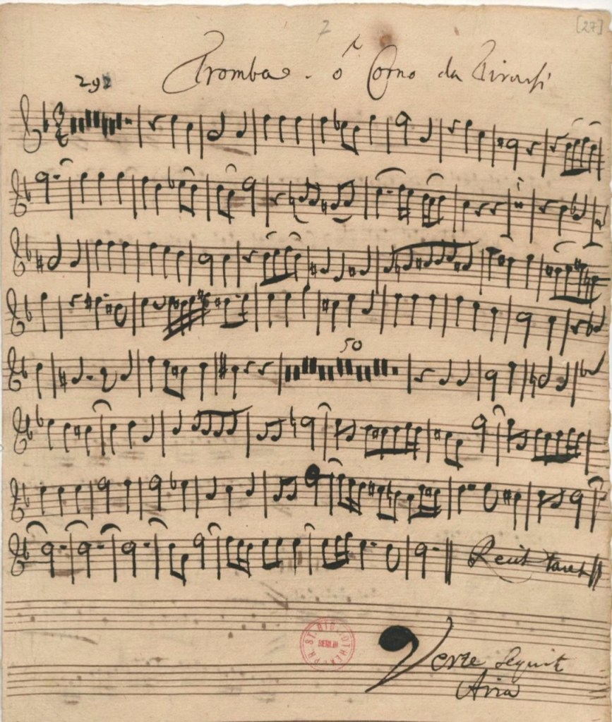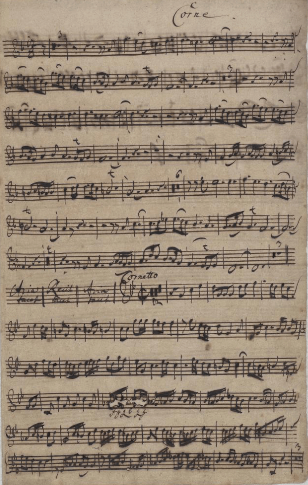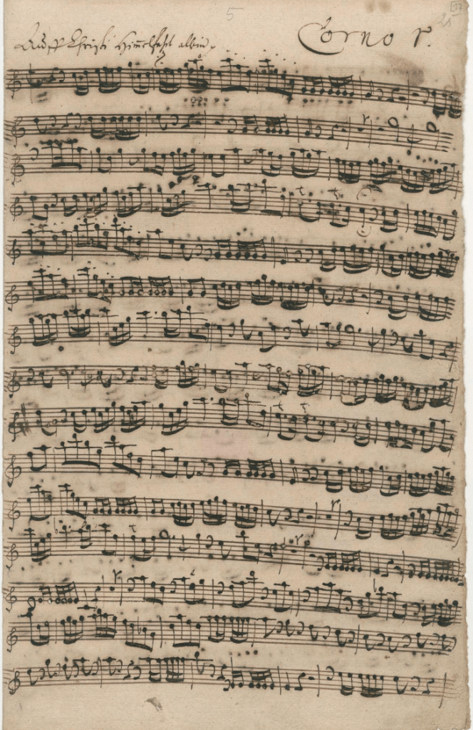 Der Instrumentenwechsel vom Horn zur Trompete ist ist in der Stimme nicht notiert, erschließt sich aber aus dem Eintrag „Tromba in unisono“ in Satz Nr. 2 in der Partitur . Am Ende der dritten Zeile der Stimme ist der Wechsel zurück zum Horn angezeigt: „Corne ex F.“ (= Horn aus F = Horn in F). Dies ist die einzige Stimmungsangabe im Werk Bachs).