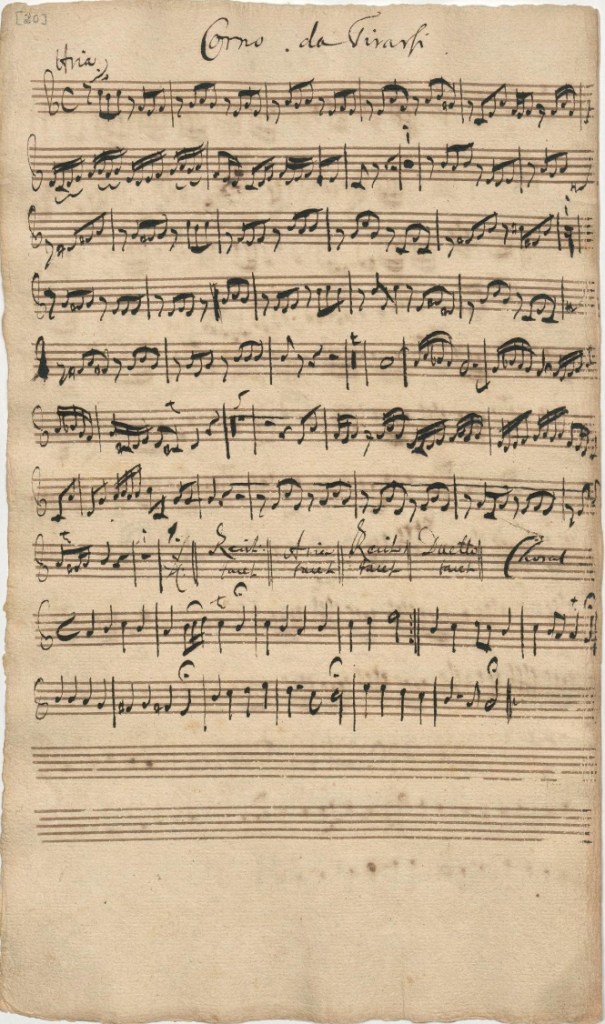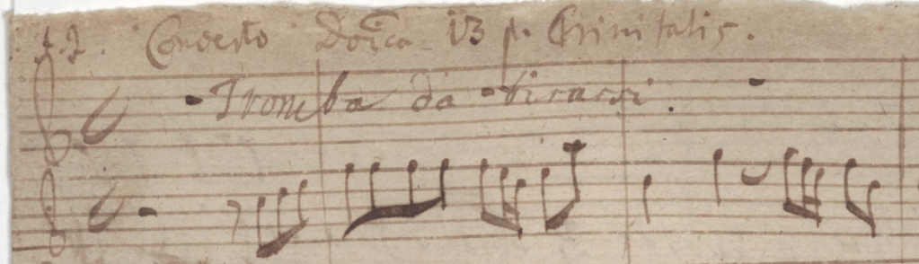 Diese obligate (= unverzichtbare) Tromba-Stimme der Aria Nr. 12 enthält keine naturtonfremden Töne. In der „Sinfonia“ Nr. 8 des „Seconda Parte“ nutzt die obligate Tromba jedoch die naturtonfremden Töne d1 und a1.