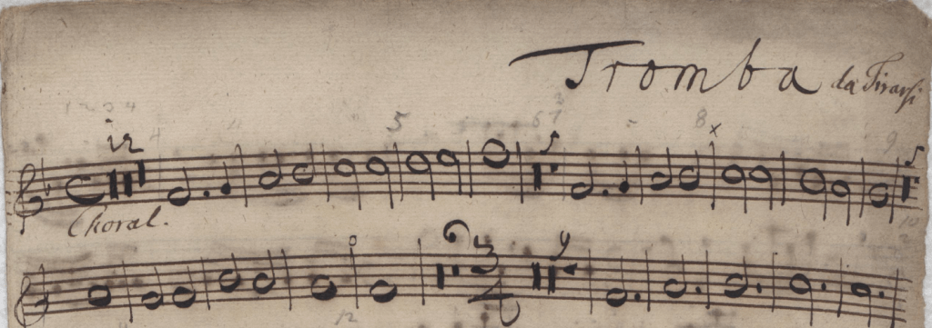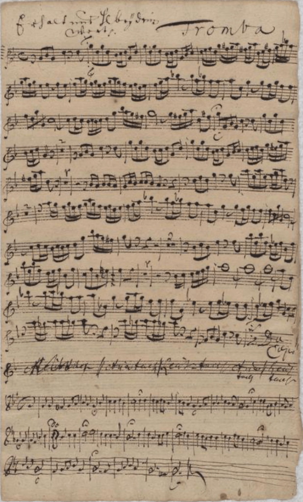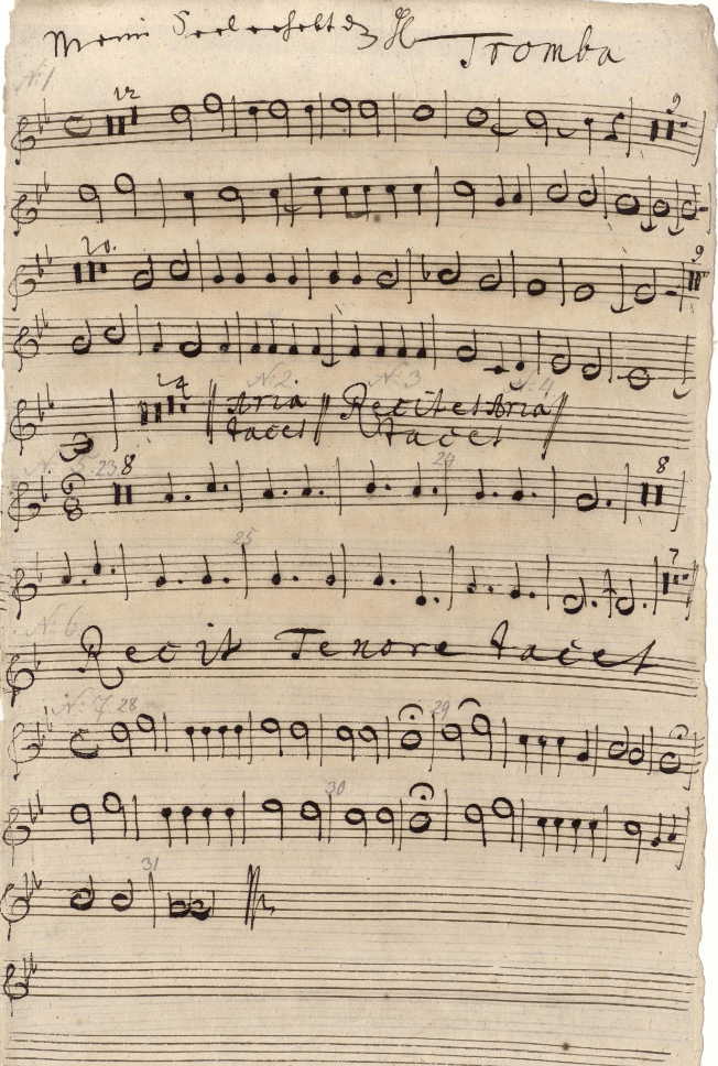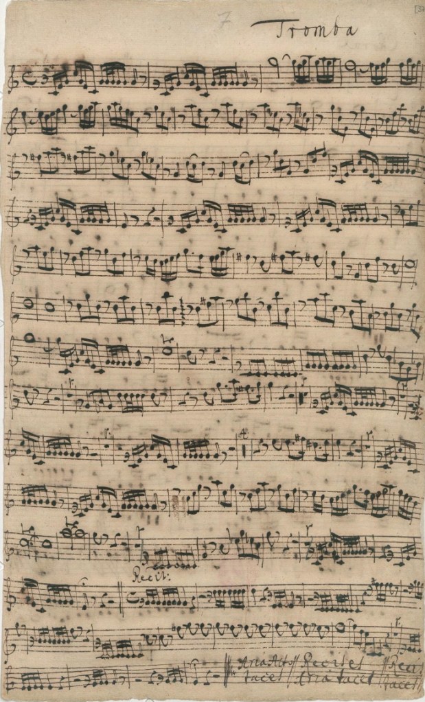 Oben: Instrumentenbezeichnung „Tromba“ in der Partitur der Kantate „Die Elenden sollen essen“, BWV 75 vom 30. Mai 1723. Bereits die Tromba-Stimme der Sinfonia Nr. 8 enthält naturtonfremde Töne.