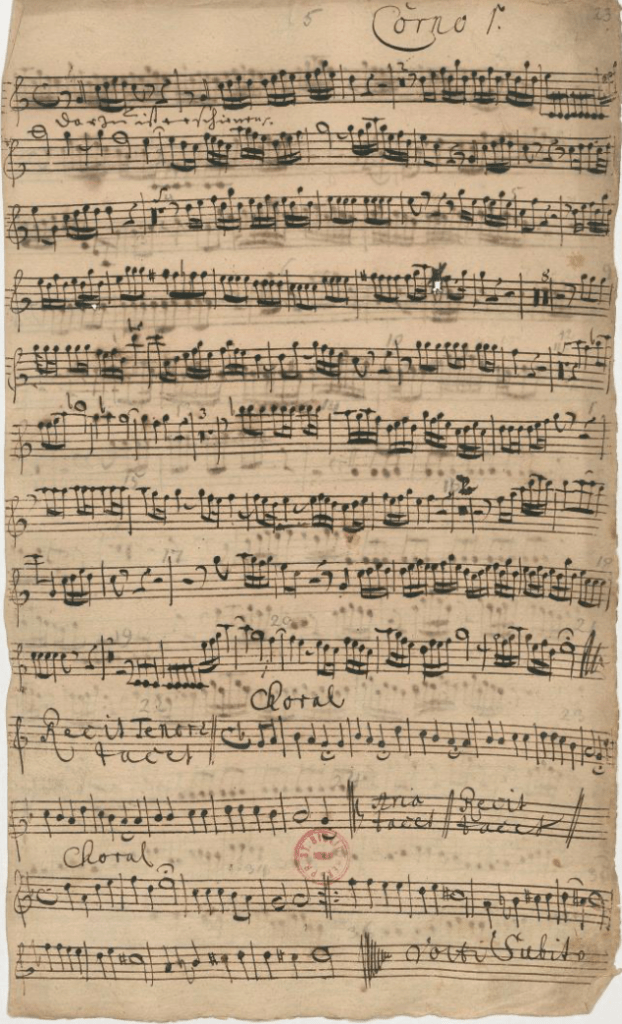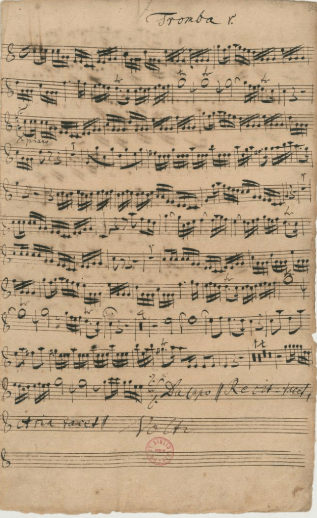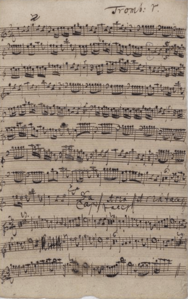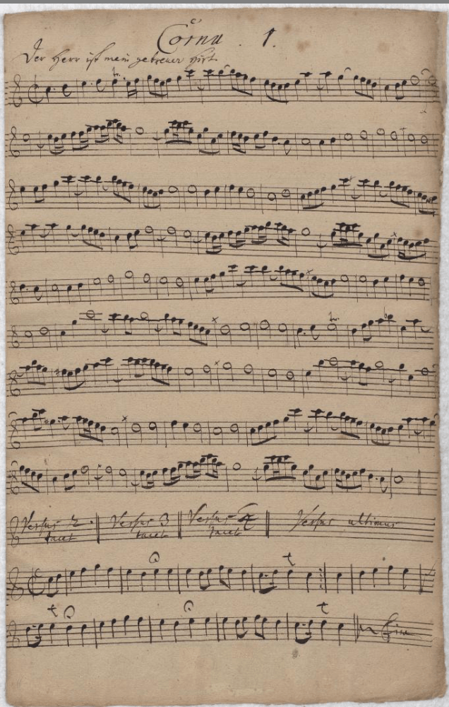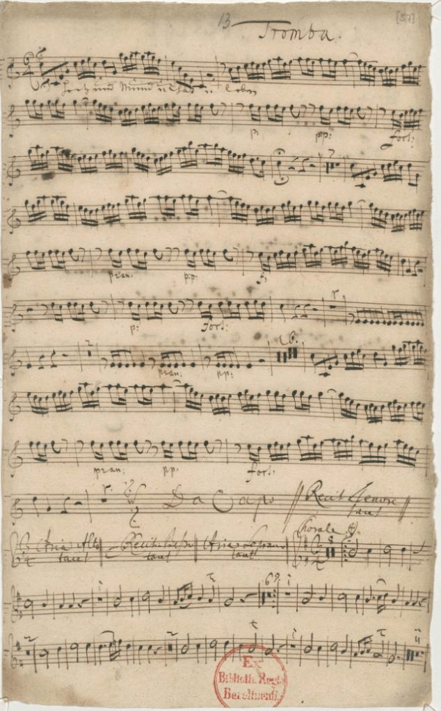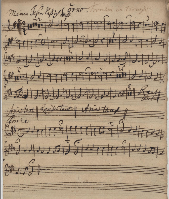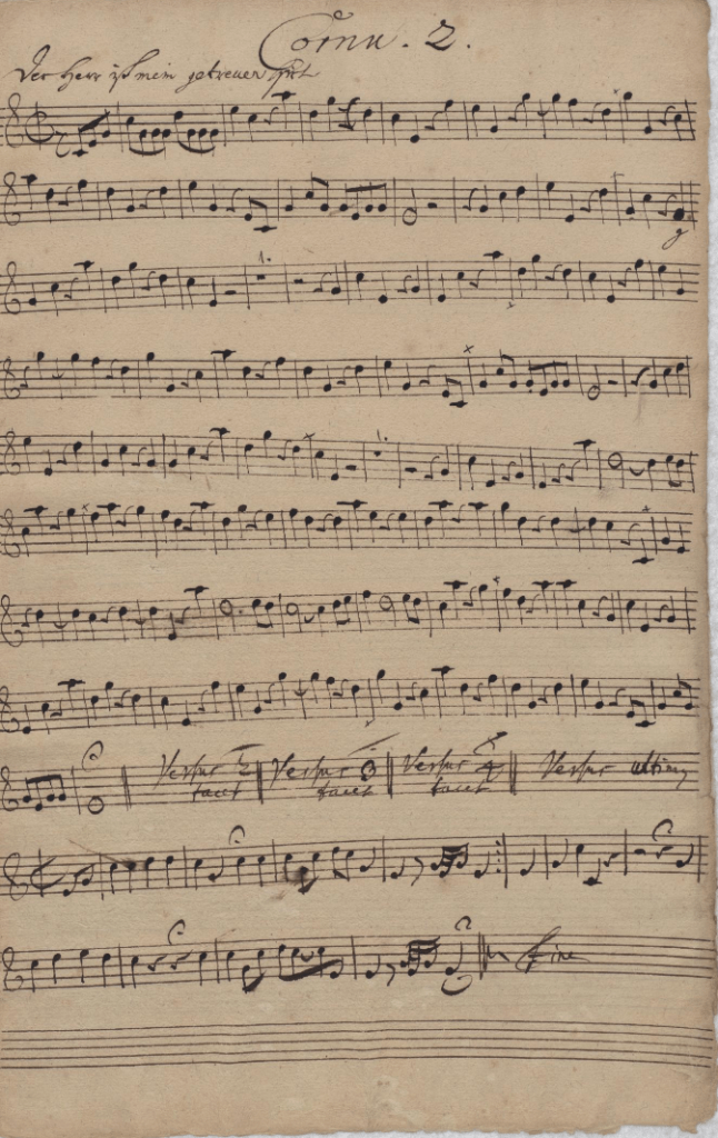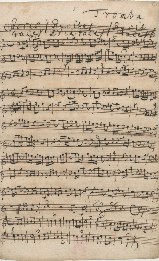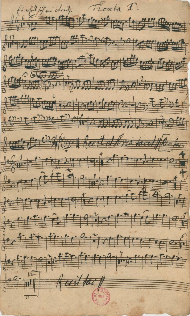 Zu sehen ist die erste Seite der Partitur-Abschrift von ca. 1740-60. Die Partitur liegt in der Staatsbibliothek zu Berlin, Preußischer Kulturbesitz, Musikabteilung mit Mendessohn-Archiv, und war Teil der ehemaligen Sammlung Georg Johann Poelchaus (1773 – 1836). Über der erstern Zeile steht links die Besetzungsangabe „Obboe. ov. (= oder) Tromba da tirarsi“. Die Partitur enthält ab Takt 20 den Catus Firmus mit naturtonfremden Tönen. Im Verlauf der Kantate enthält die Trompeten-Partie Passagen in der Clarinlage ohne besondere naturtonfremde Töne, im Verlauf aber immer wieder naturtonfremde Töne (d1, f1, a1, h1) der tieferen Lage in mehreren raschen Presto-Passagen.