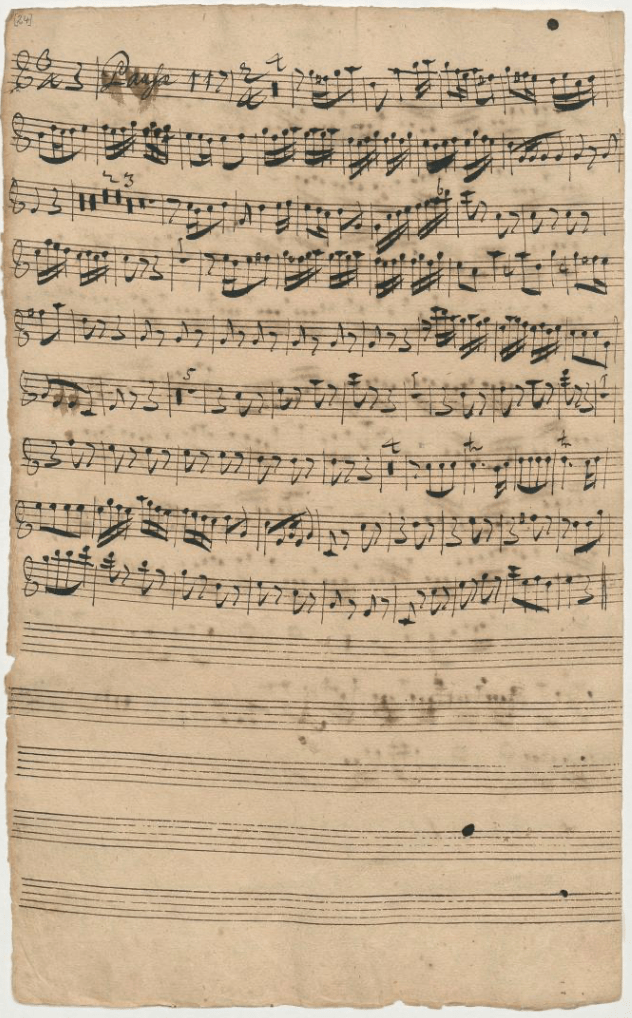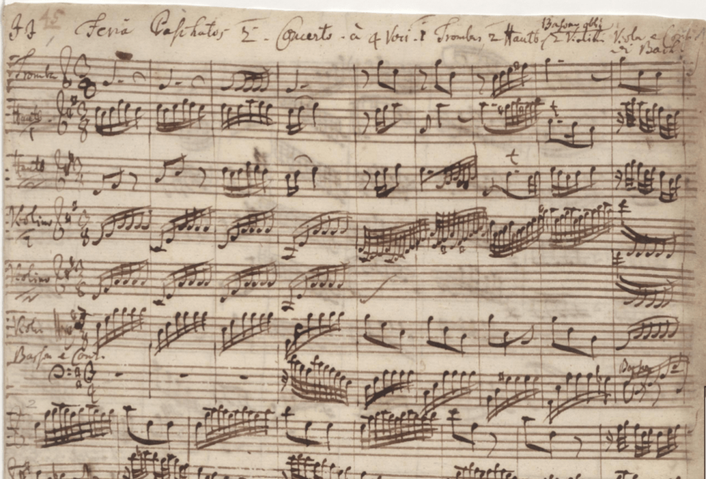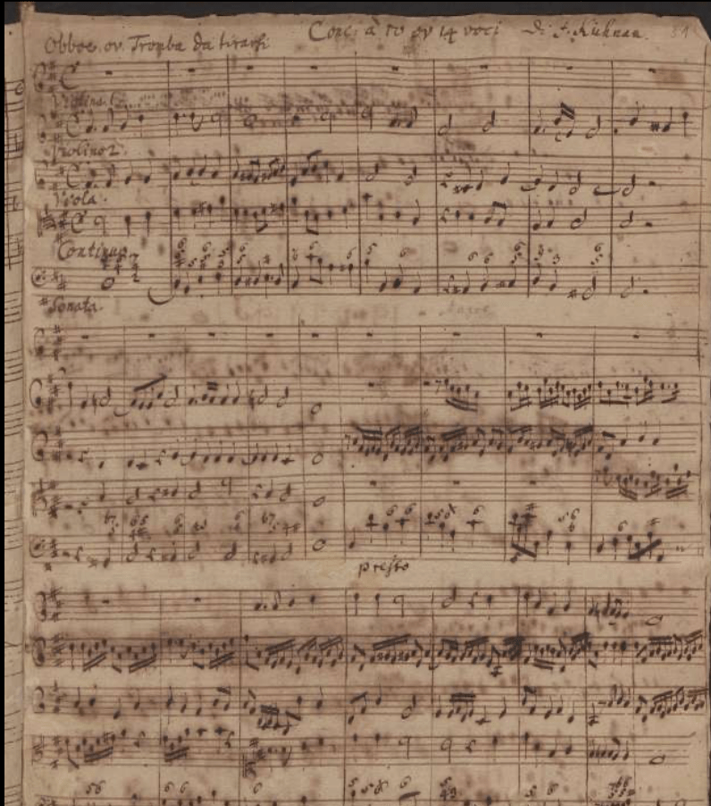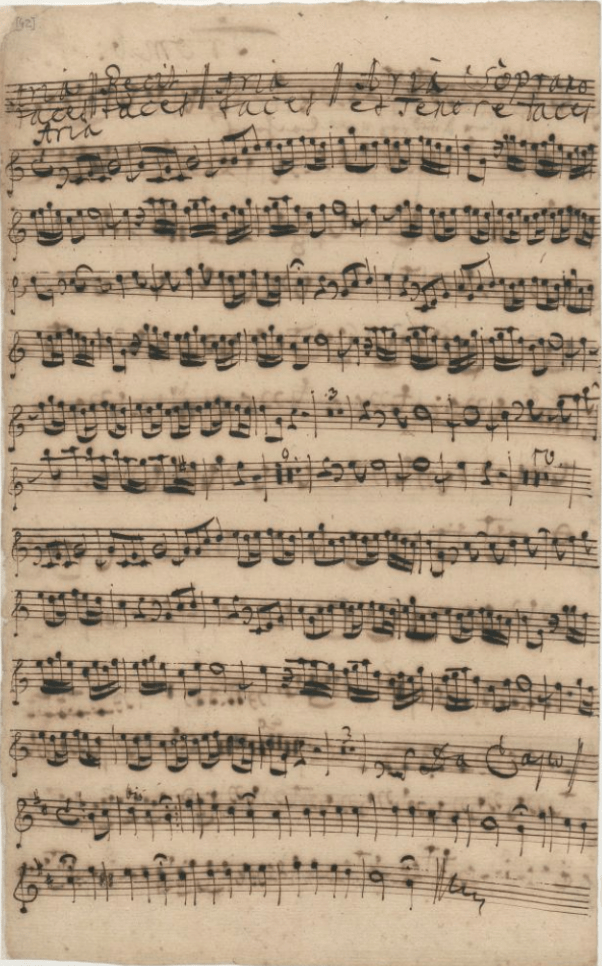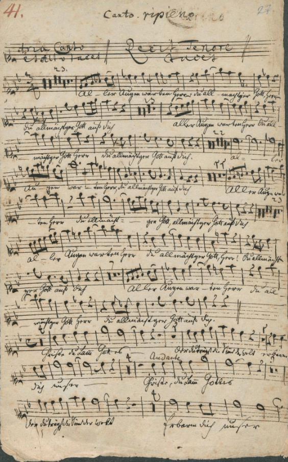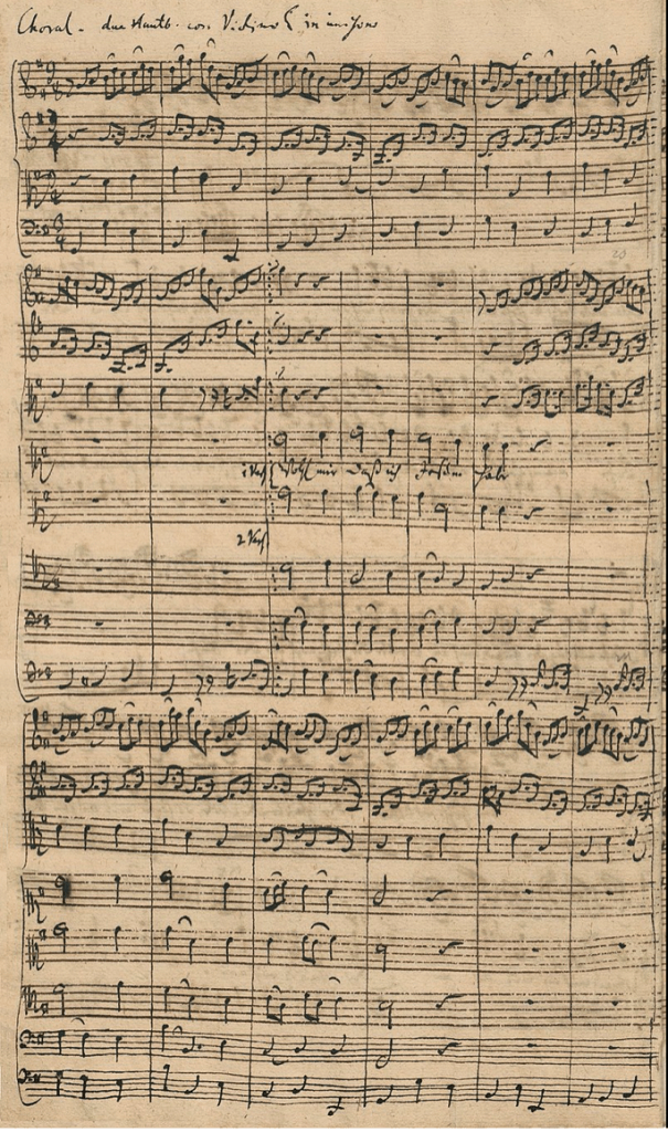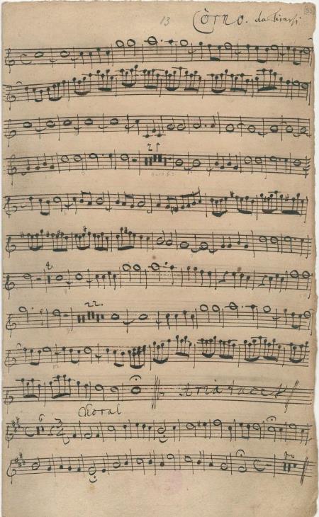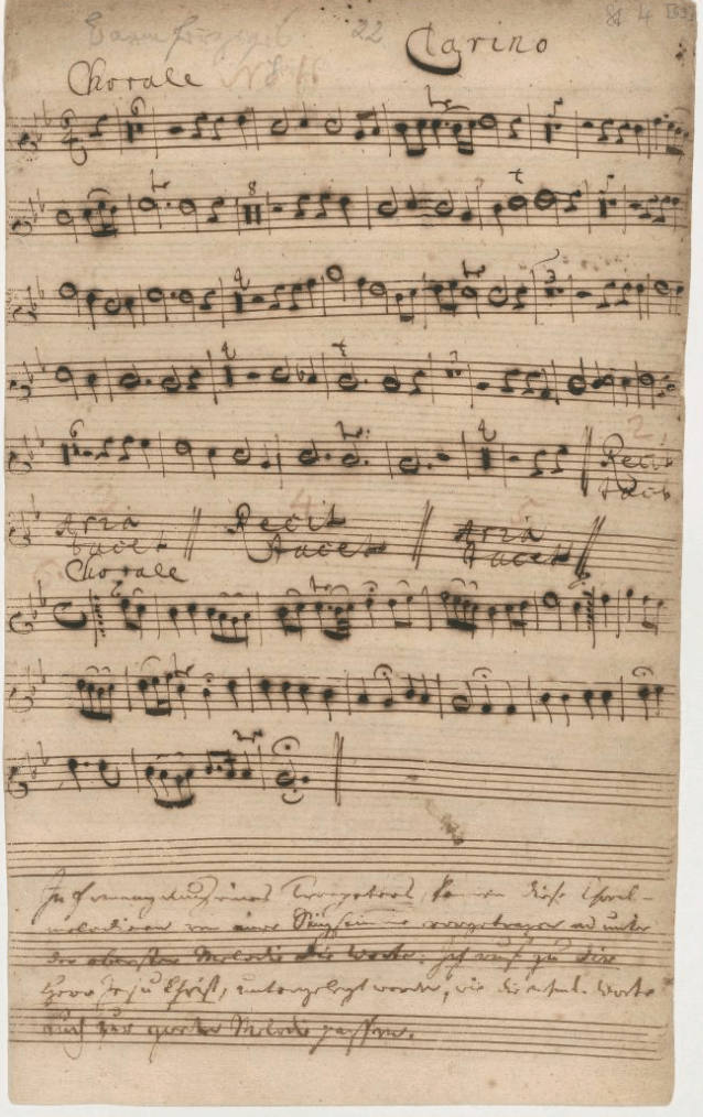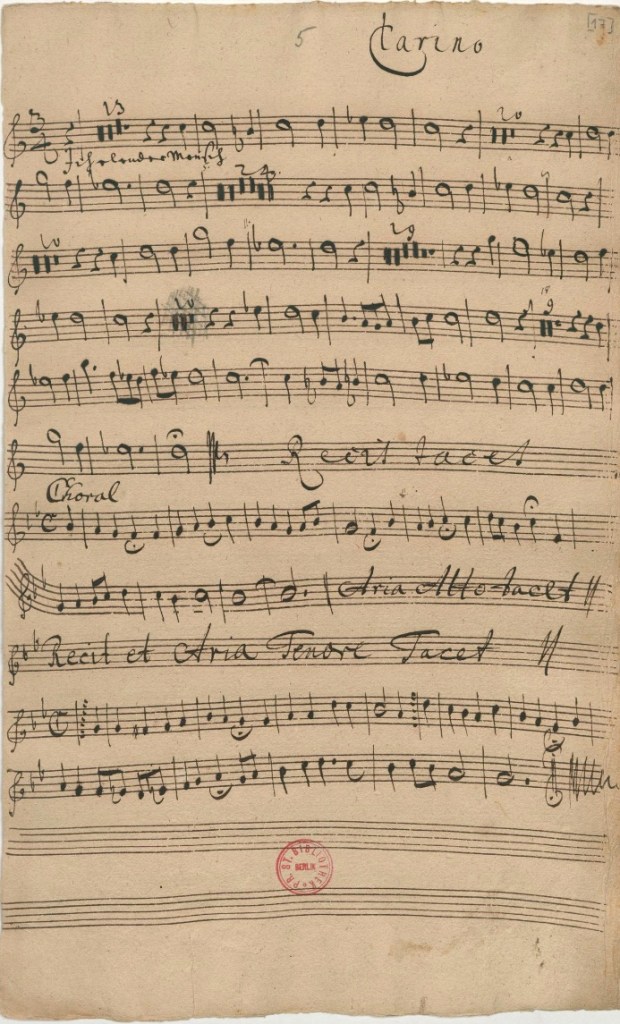 Zu sehen ist die erste Seite der Partitur-Abschrift von ca. 1740-60. Die Partitur liegt in der Staatsbibliothek zu Berlin, Preußischer Kulturbesitz, Musikabteilung mit Mendessohn-Archiv, und war Teil der ehemaligen Sammlung Georg Johann Poelchaus (1773 – 1836). Über der erstern Zeile steht links die Besetzungsangabe „Obboe. ov. (= oder) Tromba da tirarsi“. Die Partitur enthält ab Takt 20 den Catus Firmus mit naturtonfremden Tönen. Im Verlauf der Kantate enthält die Trompeten-Partie Passagen in der Clarinlage ohne besondere naturtonfremde Töne, im Verlauf aber immer wieder naturtonfremde Töne (d1, f1, a1, h1) der tieferen Lage in mehreren raschen Presto-Passagen.
