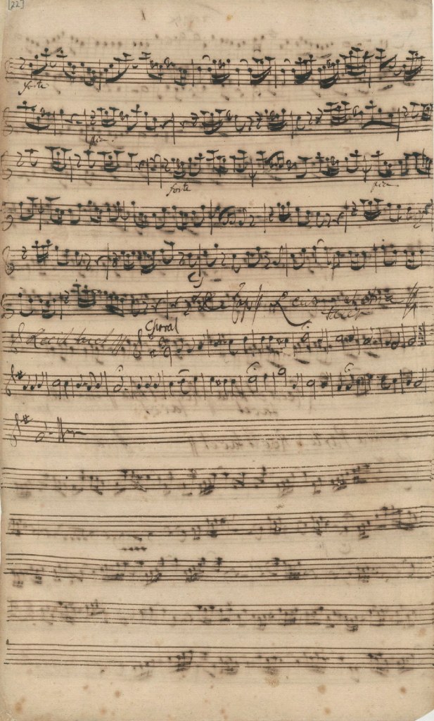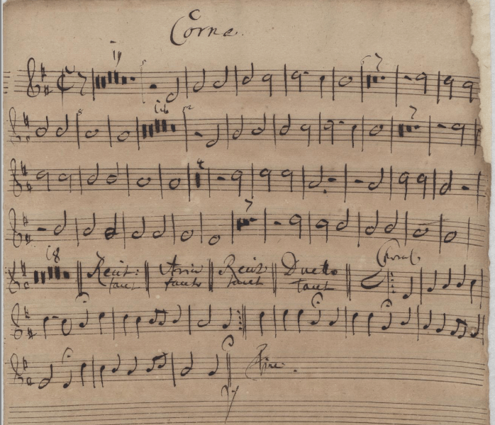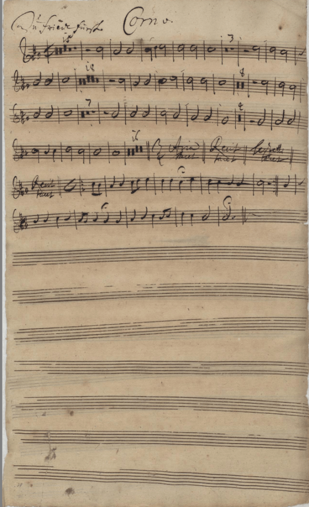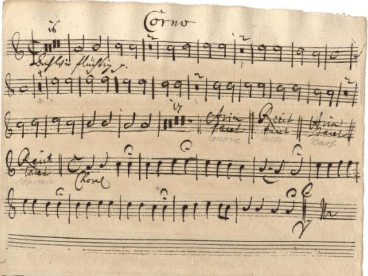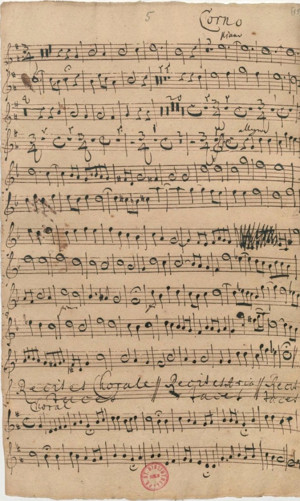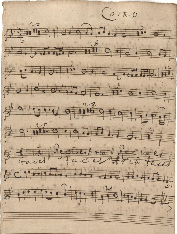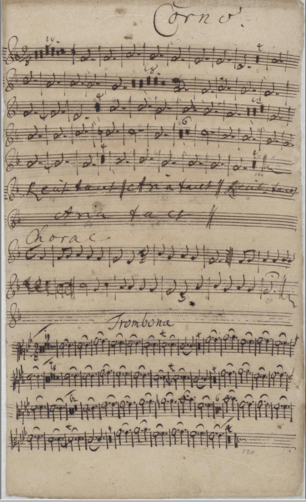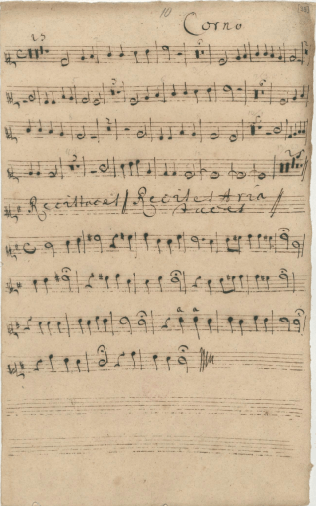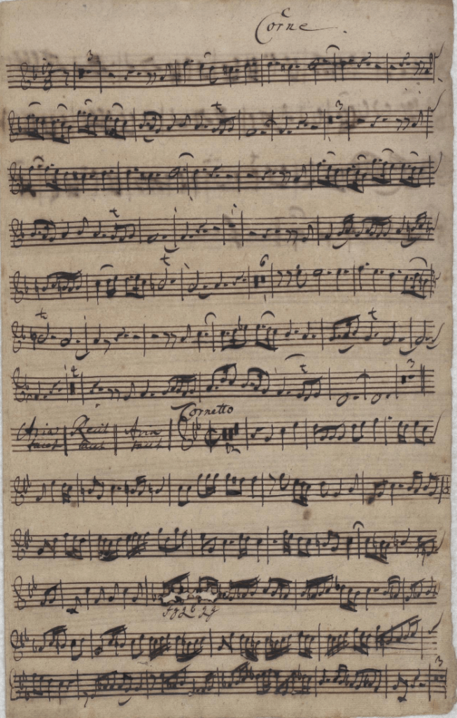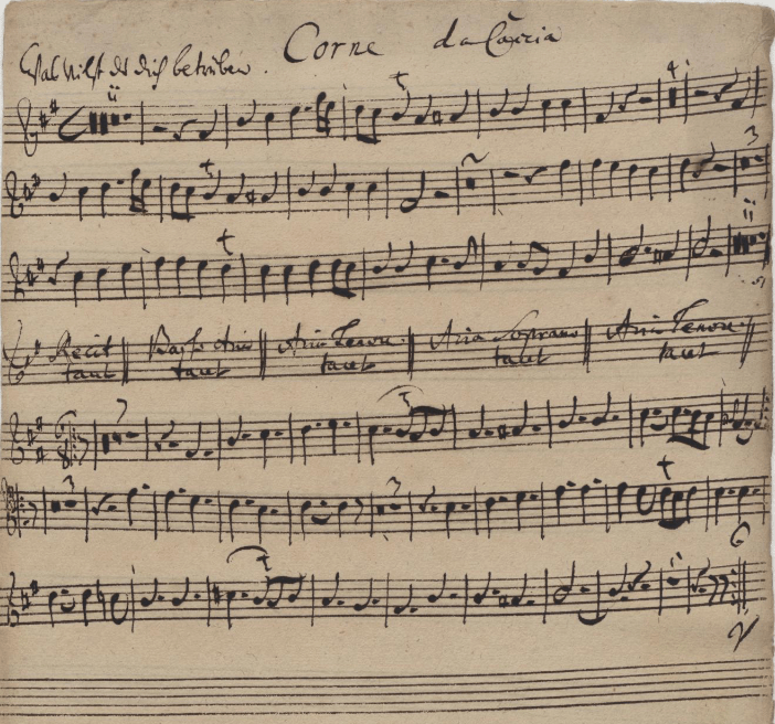 Bemerkenswert sind trotzdem weitere Aspekte. Zunächst der seltene Name „Cornu“ in den Stimmen, der in einer Partitur-Abschrift vom 12.7. 1770 zu „Corno“ wurde. Niemand kommt hier angesichts des seltenen Horn-Namens im ursprünglichen Aufführungsmaterial auf die Idee, stattdessen einen Cornetto (Zink) nutzen zu wollen. Hornstimmen sind, trotz bemerkenswert vieler Namen („Corno“, „Corne“, „Corn.“, „Cornu“, ,“Cornio“, „Cornu du Chacce“, „Corno da caccia“, „Corno per force“ oder „Corno da tirarsi“ usw.), ausnahmslos (!) als Hornstimmen erkennbar. Cornetto-Bezeichnungen wurden in Bachs Aufführungsmaterialien immer (!) unmissverständlich mit „Cornetto“, „Cornett.“ oder „Cornettino“ abkürzungslos ausgeschrieben – es lassen sich demnach im „Horn-Bereich“ keine Abweichungen hinsichtlich der Instrumentenwahl hineindeuten.