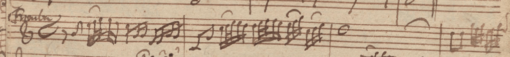 Die Indizienkette beginnt allem Anschein nach bereits vor der (1999 wieder aufgetauchten) „Clarino“-Stimme (die sehr viele naturtonfremde Töne enthält) der Kantoratsprobe von J.S.Bach in Leipzig am 7.2.1723. Denn kaum vorstellbar ist es, dass die Tirarsi-Kunst im Frühsommer 1723 „aus dem Nichts“ heraus auftauchte. Gottfried Reiche muß sie bereits zu Zeiten von Bachs Amtsvorgänger Johann Kuhnau (1660 – 1722) entwickelt haben. Die Aussage Kuhnaus zur Zugtrompete: „… mit einer Trompete wolte imitieret haben … und wo sich … nach jetziger Invention eingerichtet ist, daß sie sich nach Art der Trombon ziehen lässt…“ (siehe Johann Kuhnau: „Der musicalische Quack-Salber„, Dresden, 1700, S.82 f.) ist auch deshalb so interessant, weil sich hier ein wesentlicher Protagonist der Tirarsi-Ära aus Leipzig zum Instrumentarium – wenn auch in einem literarischen Kontext – konkret äußert (siehe ganz unten). Immerhin zwei der wenigen (ca. 30) erhaltenen Kantaten Johann Kuhnaus – nach Expertenmeinung (Prof. Dr. Michael Maul, Leipzig) von vermutlich bis zu ca. 2000 verschollenen Kirchenstücken – enthalten relevante naturtonfremde Töne. Eine dieser beiden Partien (Kantate „Gott, der Vater, steh uns bei“) ist sogar in der Partitur mit „Tromba da tirarsi“ bezeichnet – siehe nächstes Bild. Diese Partie enthält nicht nur naturtonfremde Töne in tiefer Lage, sondern auch unmittelbar wechselnde Passagen in der mittteren Clarin-Lage, in denen der 11. und 13. Naturton möglicherweise mit dem Zug korrigiert wurde, wie es später für die Tirarsi-Partien teilweise typisch zu seien scheint.
