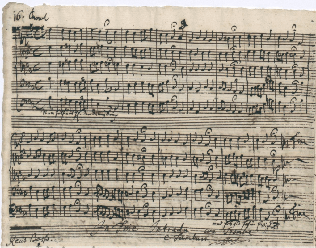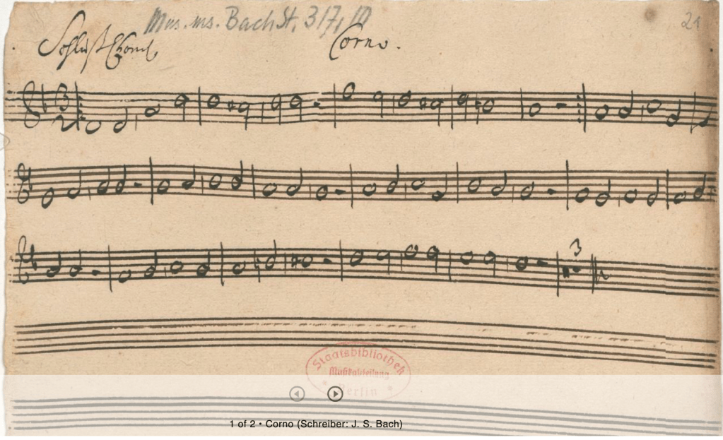 Oben: „Corno“ -Stimme der Kantate „Herr Gott, dich loben wir“ BWV 16, vom 1.1.1726, notiert von Johann Sebastian Bach.